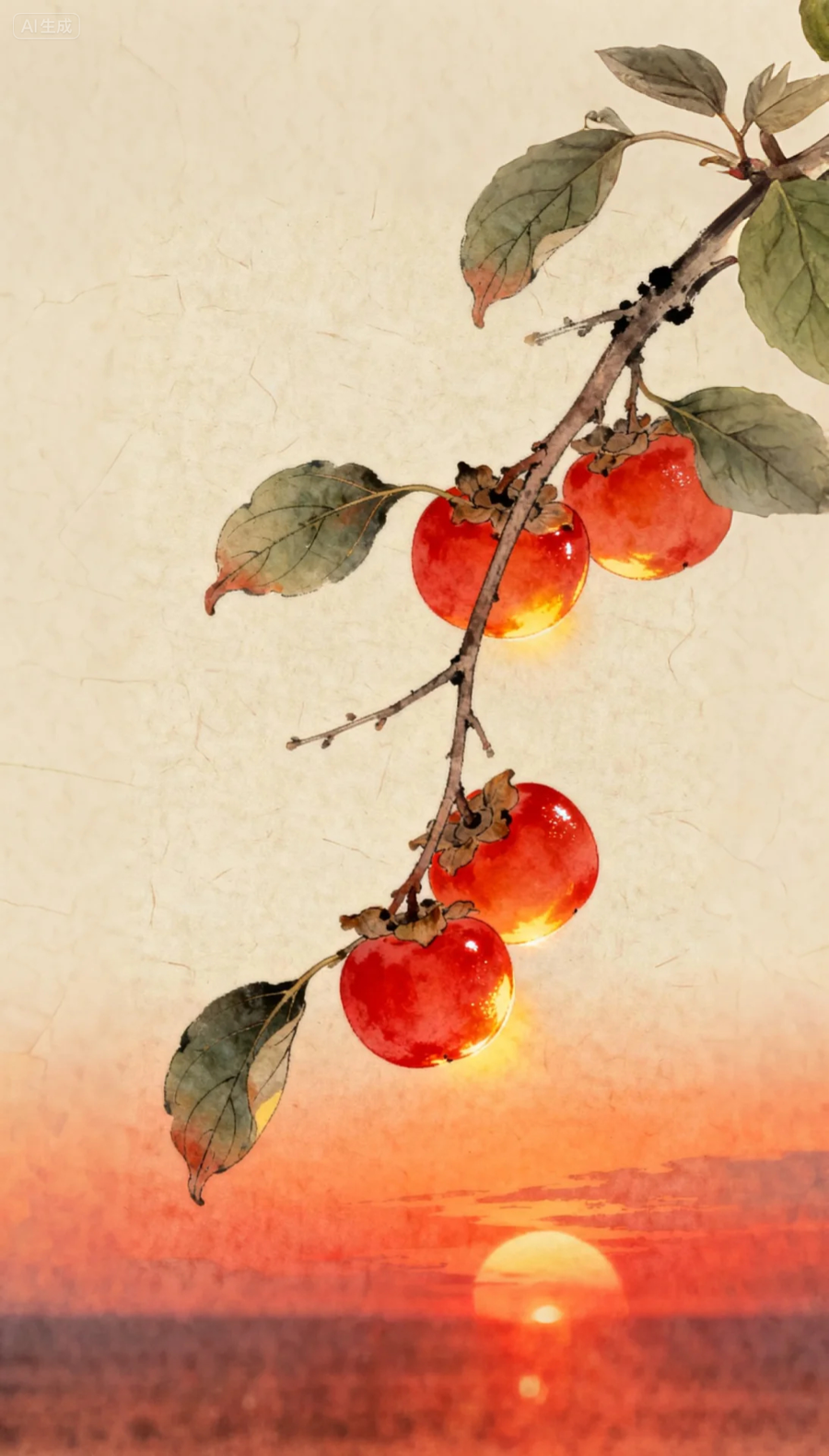 天刚蒙蒙亮,残星未散,枝头的红柿与星影交织,透着晨间清爽;等到傍晚,夕阳为它披上暖融融的霞光,格外惹眼。“晓连星影出,晚带日光悬”,没有过多修饰,却充满着生活气息。诗中的柿子因被遗漏,免于被采摘,反倒“保天年”,得以完整经历秋霜,慢慢长成饱满模样。诗句中藏着诗人的通透,并非只有被“选中”才圆满。如同柿子顺应天时、自在生长,也是一种难得的福气。