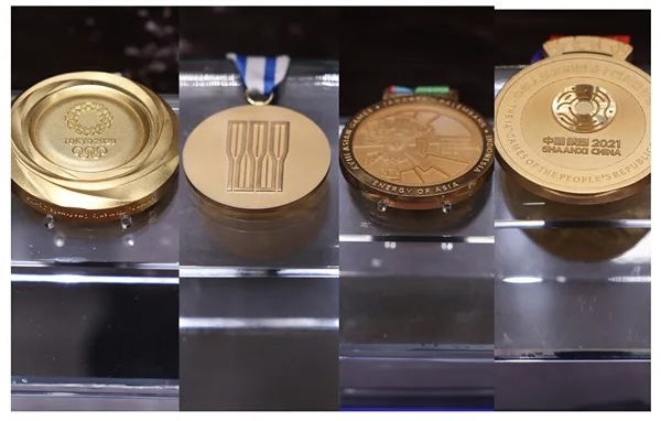 从左向右依次:2020东京夏季奥运会金牌(张灵)、2018年第18届亚运会金牌、2019年世界赛艇锦标赛金牌、2021年第14届全国运动会金牌(陈云霞)